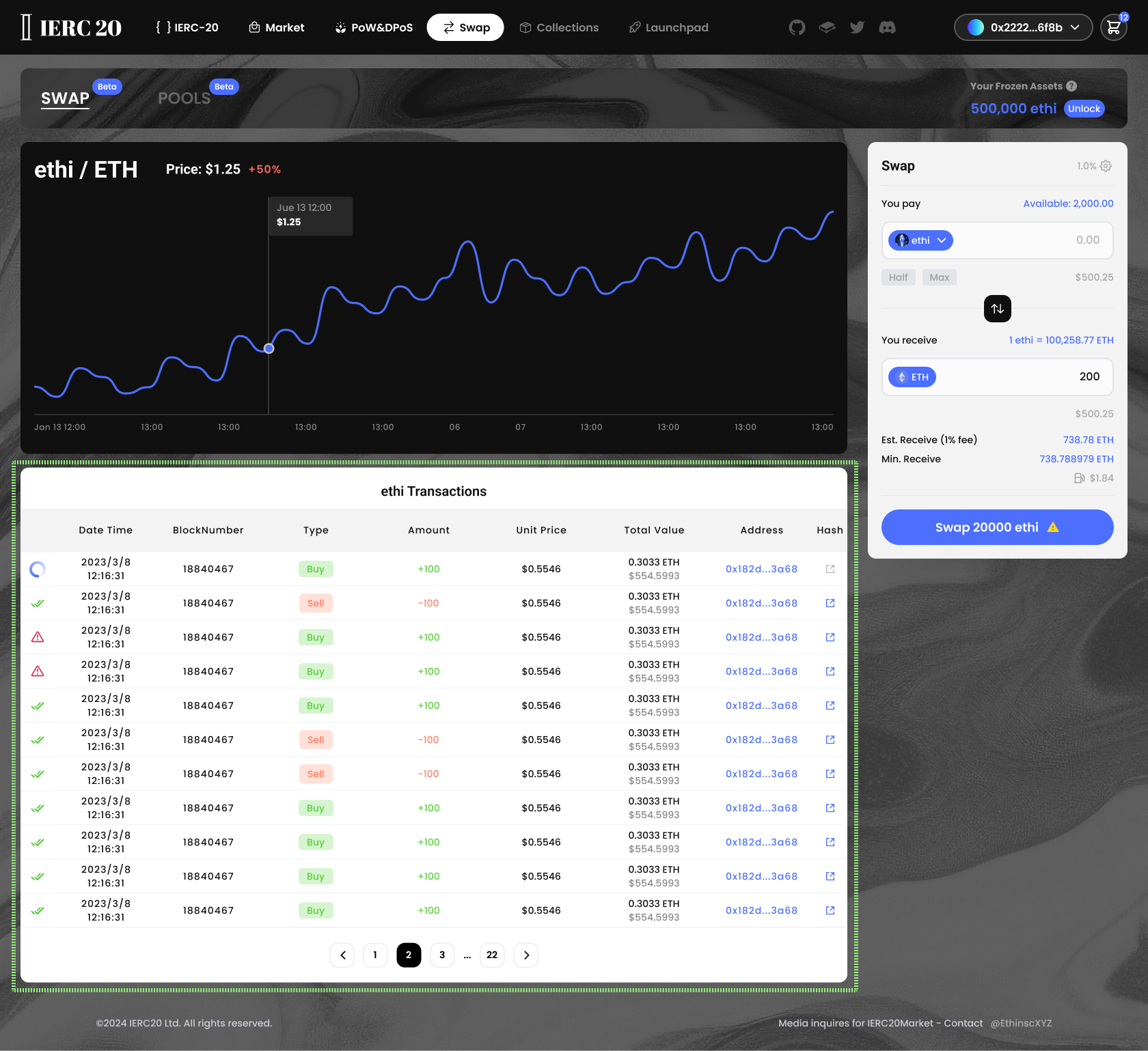 IERC Swap is a modular built on top of the ERC-20 protocol. It allows users to swap, provide liquidity, and earn inscriptions directly. Currently, the exchange only supports trading between $ETH and $ethi inscription pairs, additional trading pairs will be added soon.