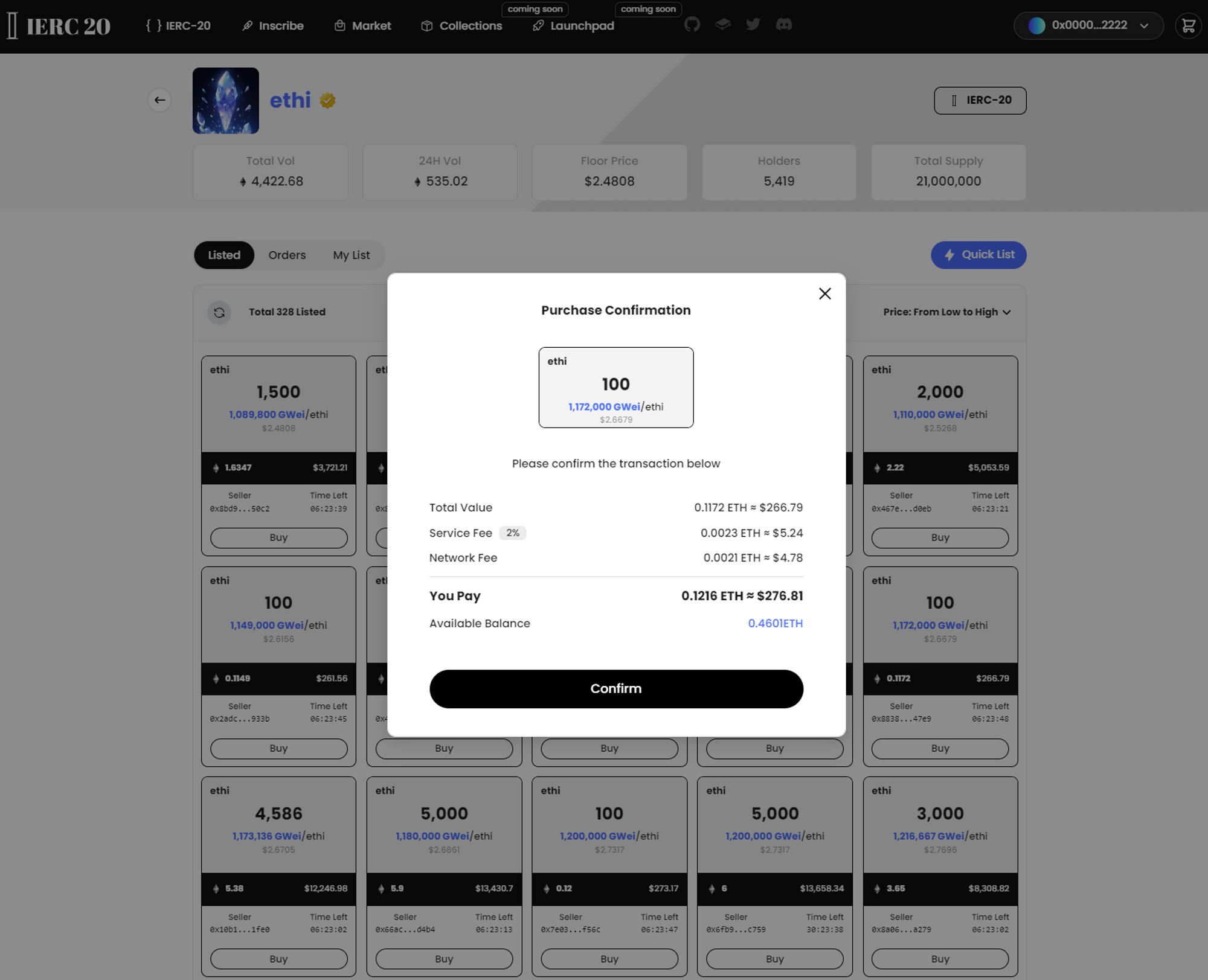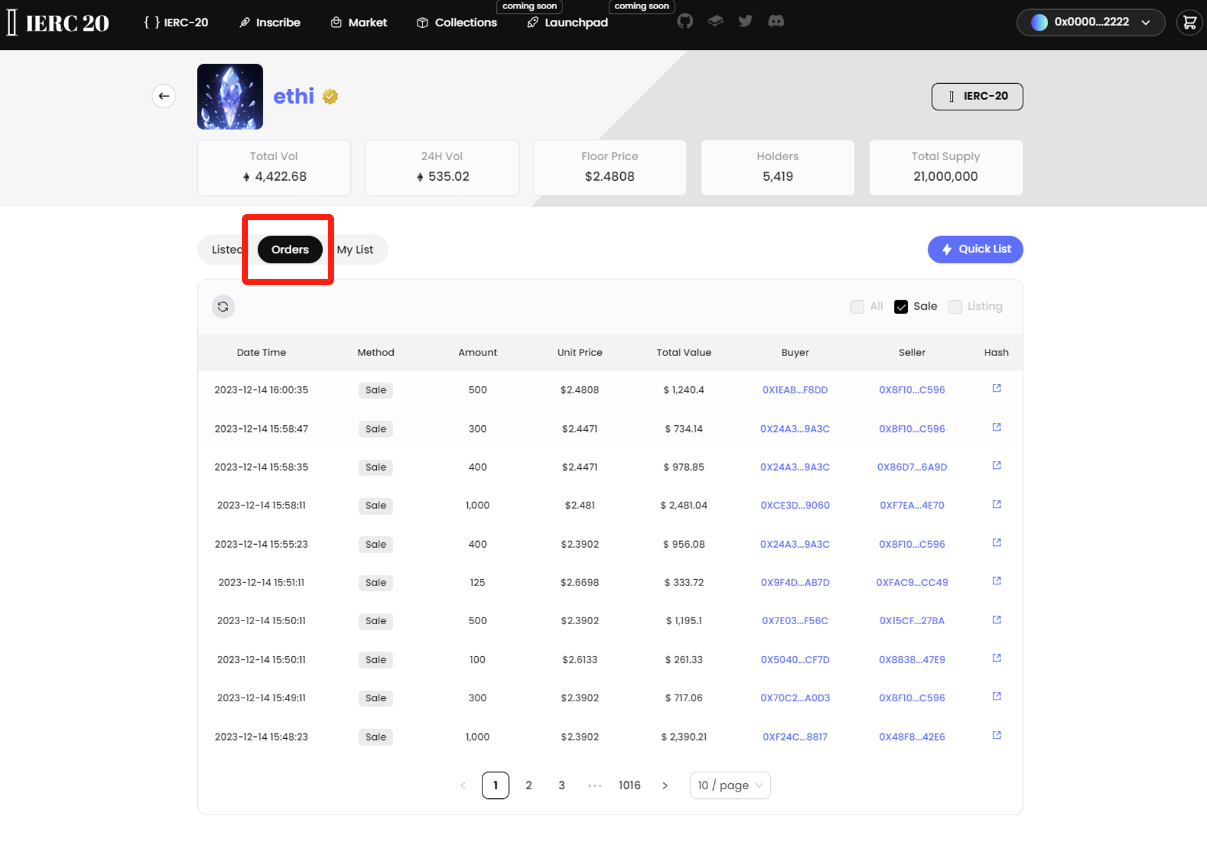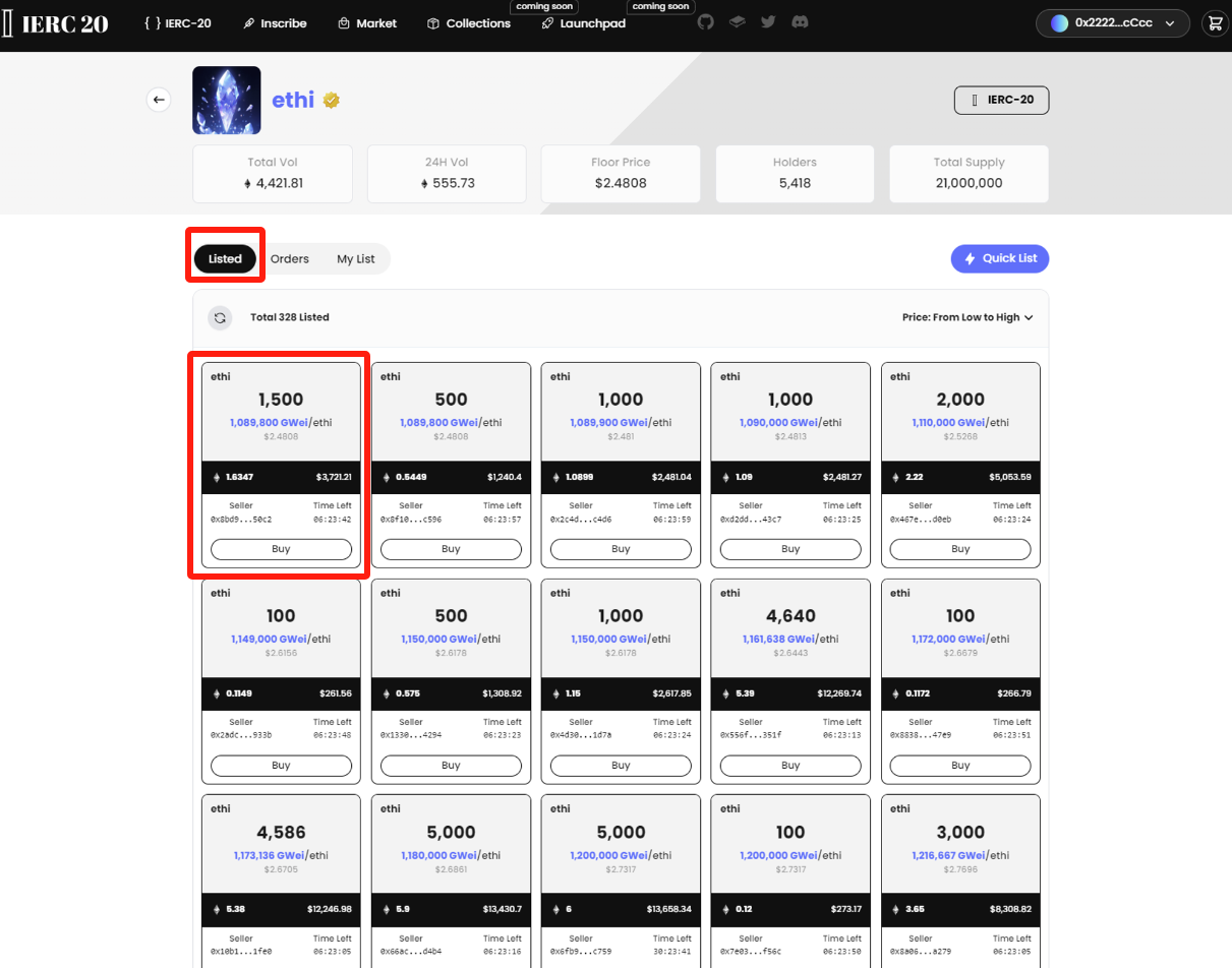 **All IERC-20 Inscriptions** are now allowed to trade on the market. Select the tick you want to buy, and you will see all orders in the **"Listed"** section.&#x20;